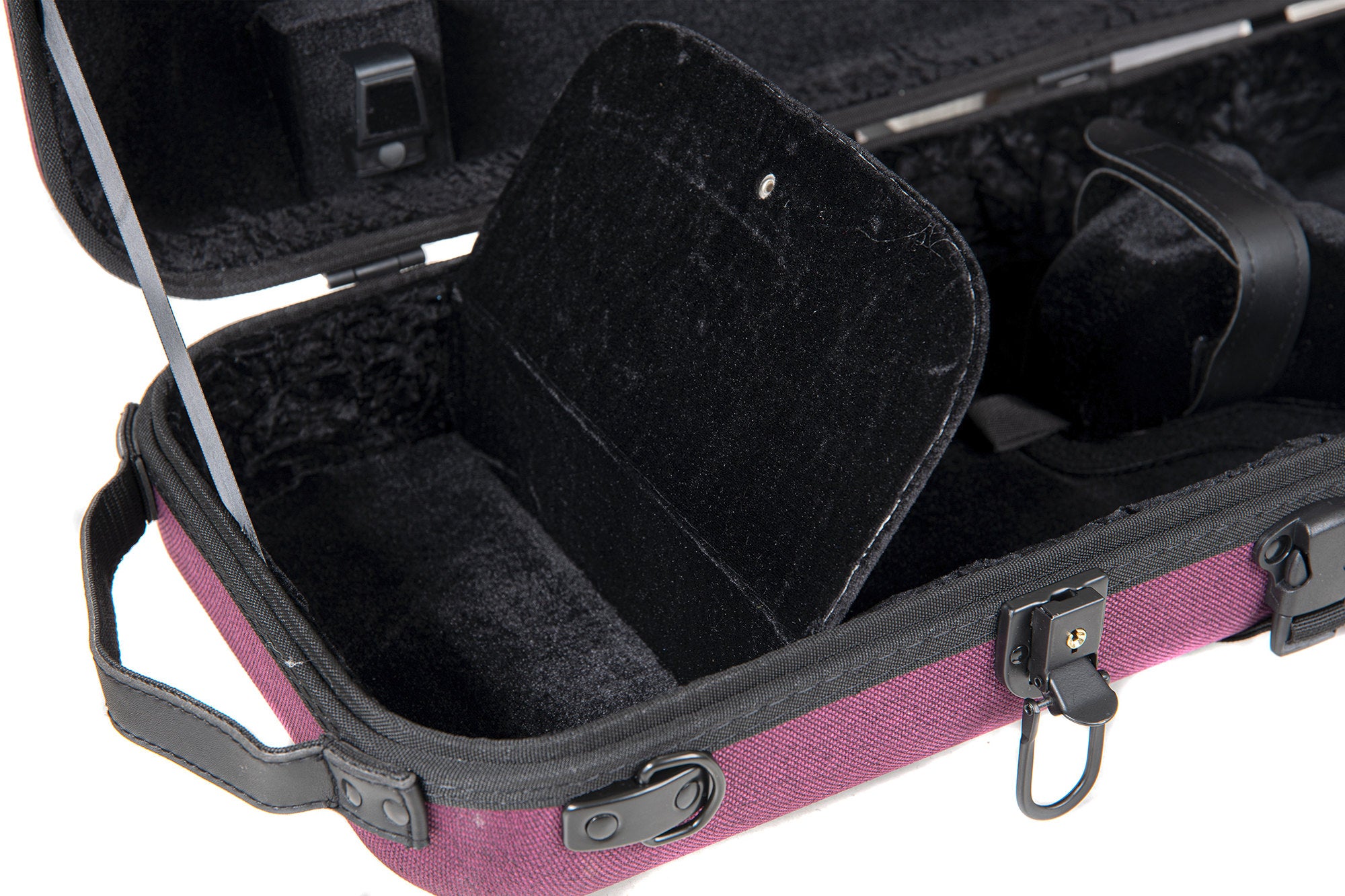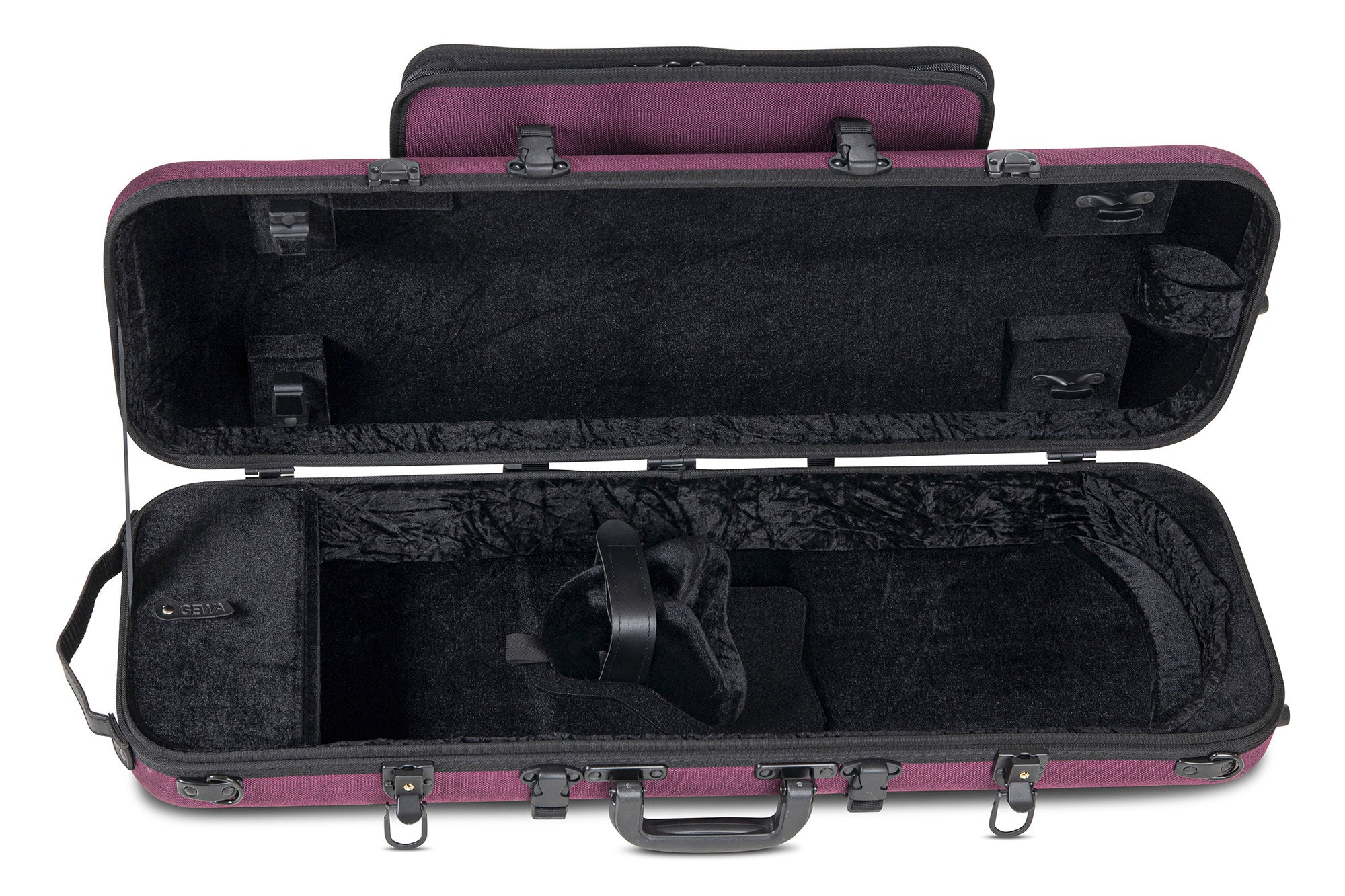 Der GEWA BIO A Violinkoffer verfügt über zwei Drehbogenhalter, von denen einer individuell verstellbar ist. Eine abnehmbare Notentasche bietet Platz für Notenblätter oder Zubehör. Ein separates Zubehörfach ermöglicht die Aufbewahrung von Kolophonium, Saiten oder anderen Kleinteilen. Das Innenfutter aus schwarzem Samt verleiht dem Koffer ein edles Erscheinungsbild und schützt die Oberfläche der Violine.